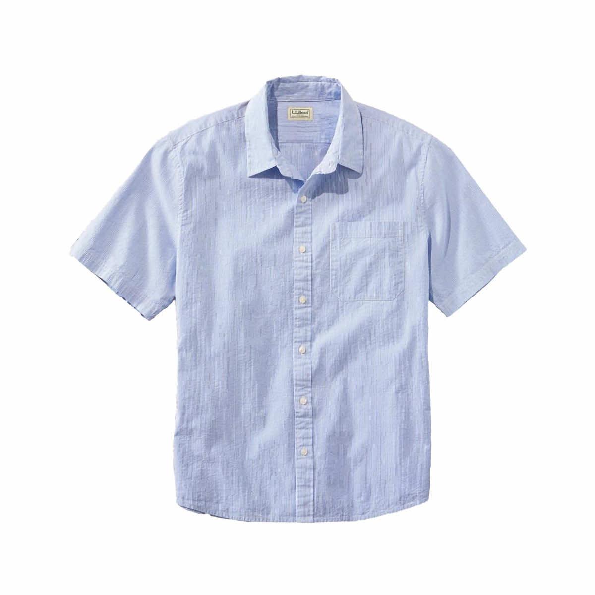 Take your summer style to a new level with the Men's Organic Seersucker Short Sleeve Shirt from L.L.Bean. Made from 100% organic cotton, this seersucker shirt is naturally cooling, breathable, and crafted to circulate the breeze. It is slightly fitted to give you a relaxed feel through the chest and sleeve with a slimmer waist. The hemline looks great tucked or untucked to fit the occasion at hand. Transition from the office to the tavern in no time when you button up the Organic Seersucker Short Sleeve Shirt.