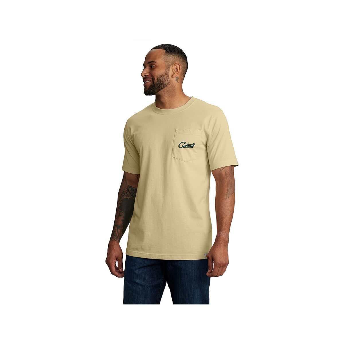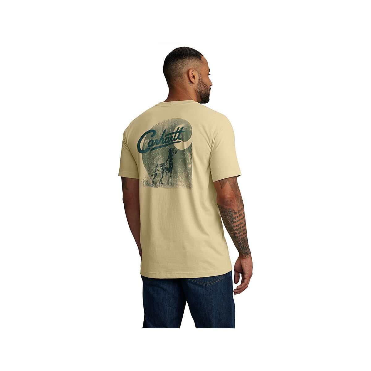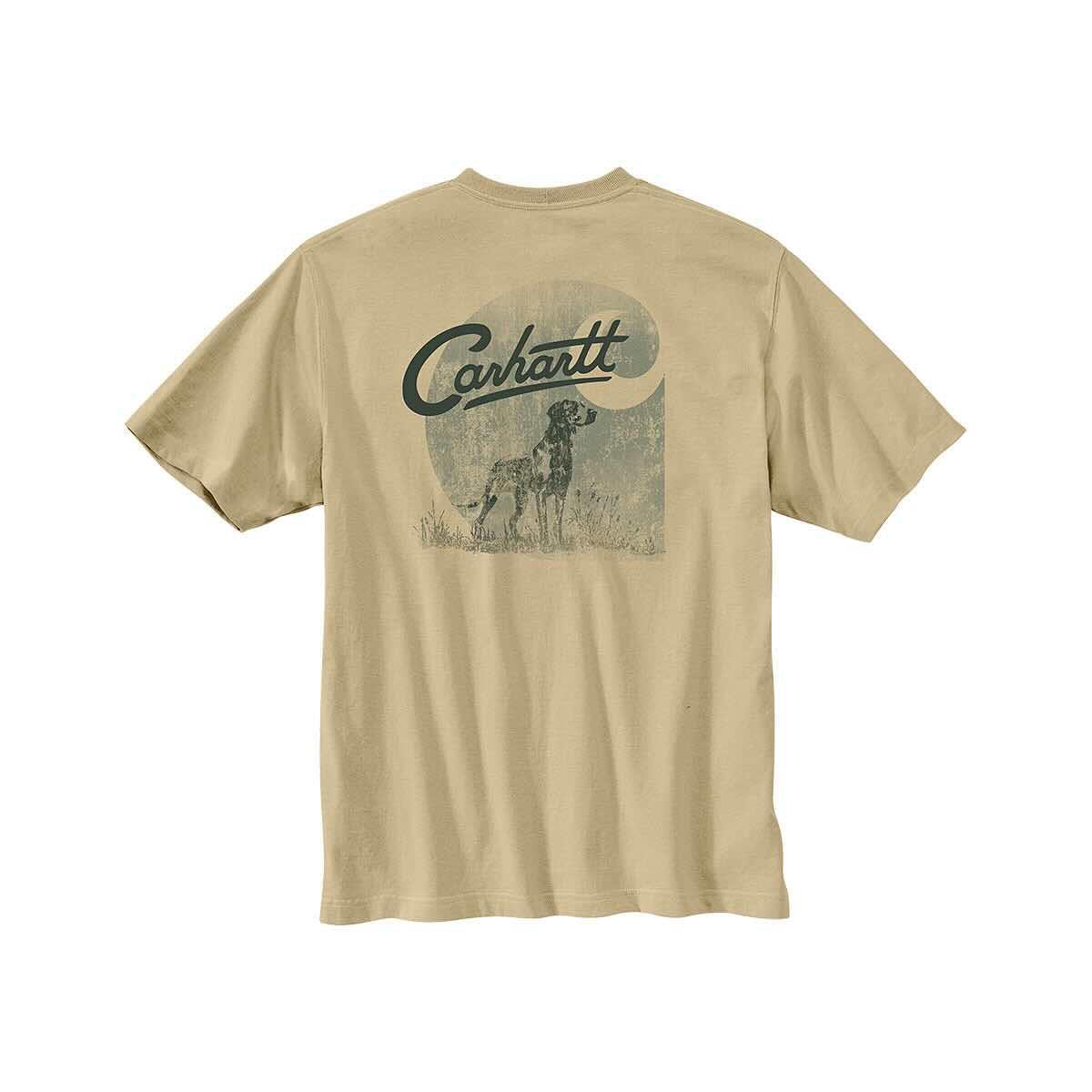 The Men's Relaxed Fit Lightweight Short Sleeve Pocket Dog Graphic T-Shirt from Carhartt is sure to be an instant best friend in your workwear wardrobe thanks to the soft, yet durable cotton/poly blend of fabric! This stylish tee will have your back from workshops to weekend adventures while amazing you with its functional quality. This top is effortlessly cool and features a handsome four-legged companion on the back, plus the chest pocket keeps your essentials close by. You'll be fetching for this t-shirt season after season!