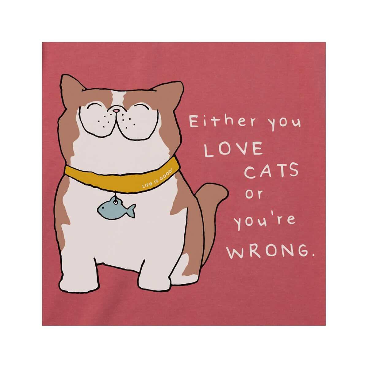 You'll be pleased and purring in the Women's Exotic Love Cats Short Sleeve Crusher T-Shirt from Life is Good! Made from 100% USA-grown cotton and garment-washed to the ideal softness, this tee will amaze you with its high quality and style. The fun and vibrant graphic on the front features a rotund, smiling kitty and a reminder that you either love cats or you're wrong. This t-shirt is the cat's meow!