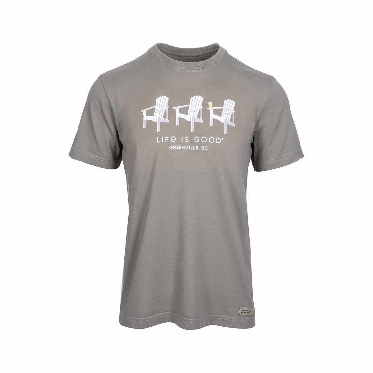 Escape to a place where life moves differently, the captivating city of Greenville, with the lightweight, breathable comfort of the Men's Greenville Three Chairs and a Beer Short Sleeve Crusher T-Shirt from Life is Good. This short-sleeved graphic is made from 100% cotton, which has been garment-washed for next-to-skin softness on day one. It features self-fabric taping and ribbing along the neckline for a flattering fit. Printed across the chest is a relaxing image of beach chairs with a beer, with a nod to the brand Life is Good and Greenville, South Carolina. Let the mountain vibes take hold and kick back with a cold one, and let this comfy tee speak for you.