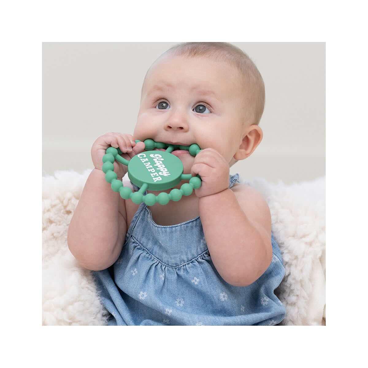 Give their gums the relief they need with the Happy Camper Happy Teether Baby Toy from Bella Tunno! This 4.5-inch silicone teething ring is designed to have an easy grip for little hands, plus it's freezer and dishwasher-safe. Soothe sore gums in style with this darling baby teether!