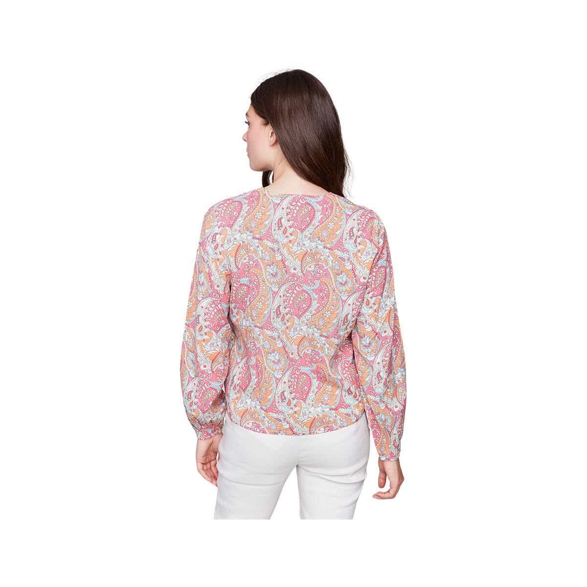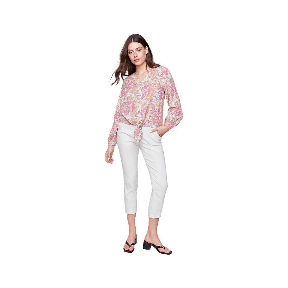 Introducing the Women's Front Tie Long Sleeve Blouse from Charlie B, a fashionable and versatile piece featuring a flattering front tie detail and comfortable long sleeves, perfect for adding a touch of chic to any outfit. This stylish women's blouse offers a unique design element with its adjustable front tie, allowing you to customize your look. Crafted for both style and comfort, this long-sleeved blouse is ideal for layering or wearing on its own. Elevate your wardrobe with this must-have front tie blouse.