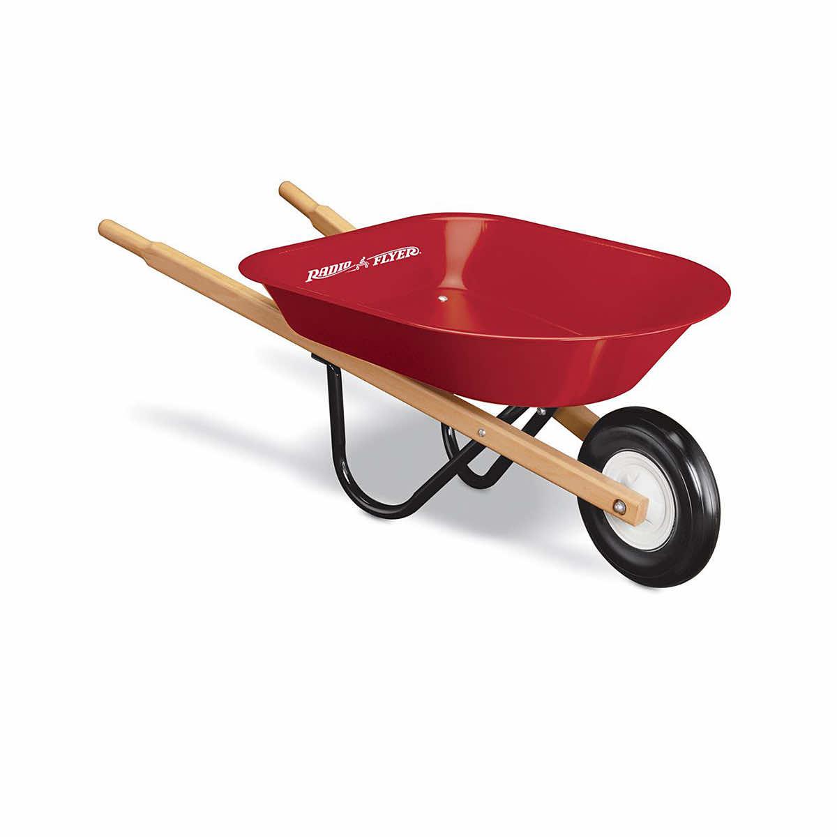 The Kids' Red Wheelbarrow Wagon Toy from Radio Flyer is a real wheelbarrow designed for kid-sized fun. Whether your little one brings this garden wheelbarrow around your living room to plant imaginary flowers or actually helps you gather veggies from your backyard garden, they are sure to love their new toy! With a seamless steel tray, real wood handles, and a durable molded wheel, this Kids' Wheelbarrow toy is perfect for both indoor and outdoor use. Use this children's wheelbarrow for fun play, as porch or garden décor, as a gardening helper, or as a cute little storage bin for other toys.