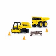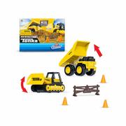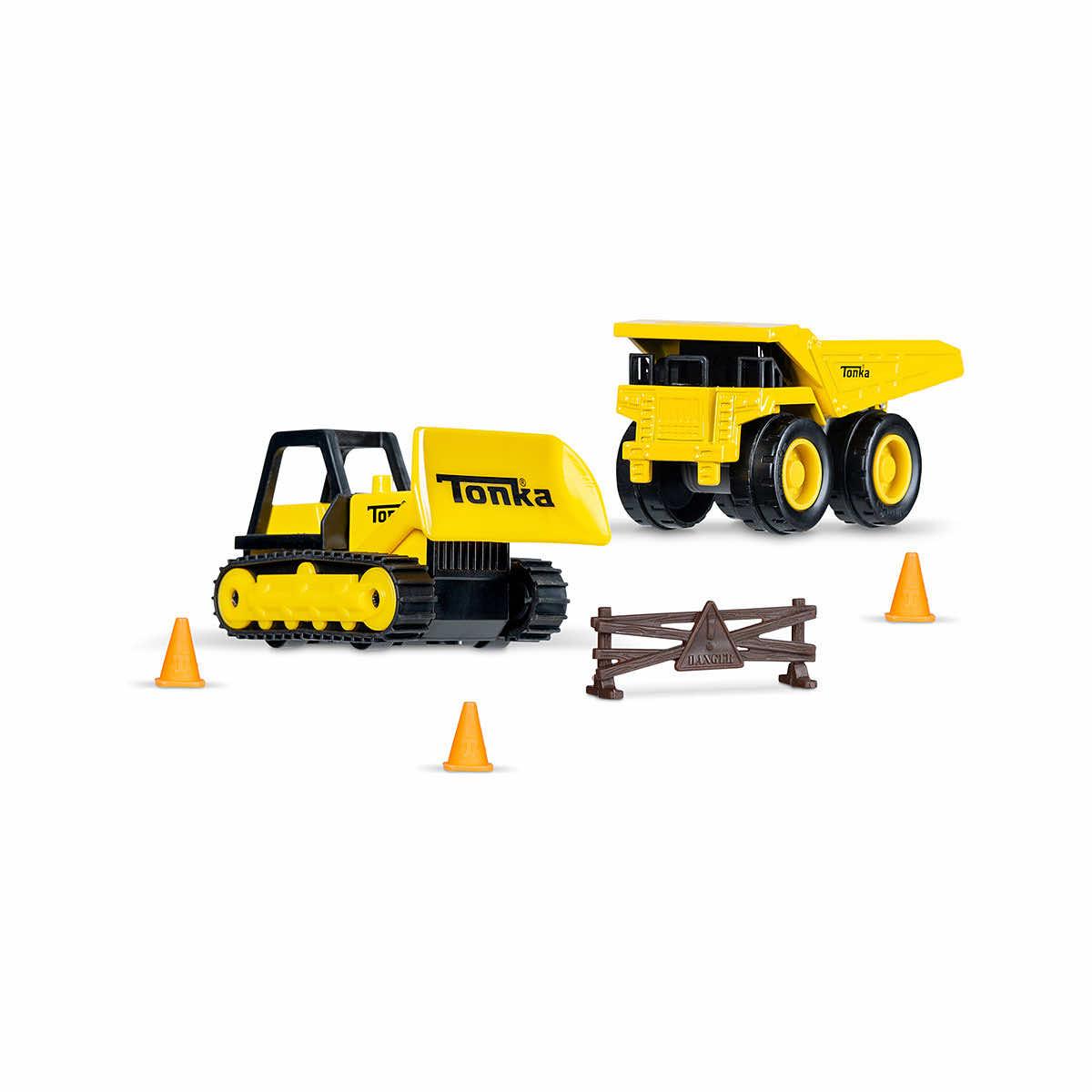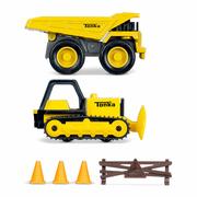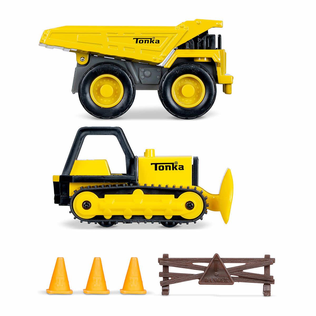 - Includes metal dump truck, metal bulldozer, barricade, and 3 cones