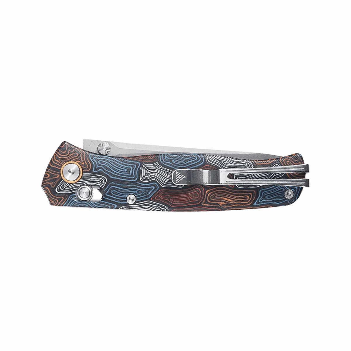 The 255L Medal Folding Knife from SRM Knives is crafted for quality and has a sturdy construction for your EDC tasks from the jobsite to the campsite and everywhere in between. It features a sharp drop-point blade made from durable laminated 140Cr steel with a clean bead-blast finish for a sleek look that holds an edge for consistent sharpness. The G10 handle delivers a lightweight design and a secure grip in a cool multi-color pattern. The Ambi-lock design, paired with a ceramic ball-bearing pivot, creates a strong and safe locking mechanism for a dependable and smooth deployment. The 255L Medal Folding Knife is built with impressive versatility to handle your next project.