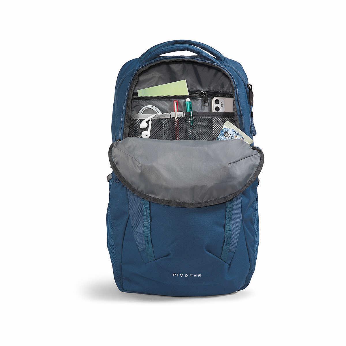 Transition from the classroom to the trail with the Pivoter Backpack from The North Face. This pack is designed with a FlexVent™ suspension system that features a flexible yoke built from custom injection-molded shoulder straps, an unbelievably comfortable, padded back panel, and a highly breathable lumbar panel. The Pivoter stands up on its own for easy loading and unloading. The suspension is certified by the American Chiropractic Association. The large compartment offers optimal storage for books and binders while the front compartment provides secure organization for smaller items. The padded 15-inch laptop sleeve adds protection against bumps and shuffling.