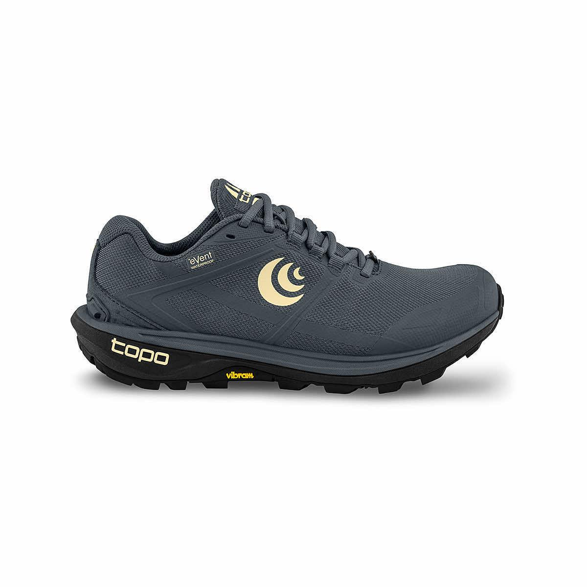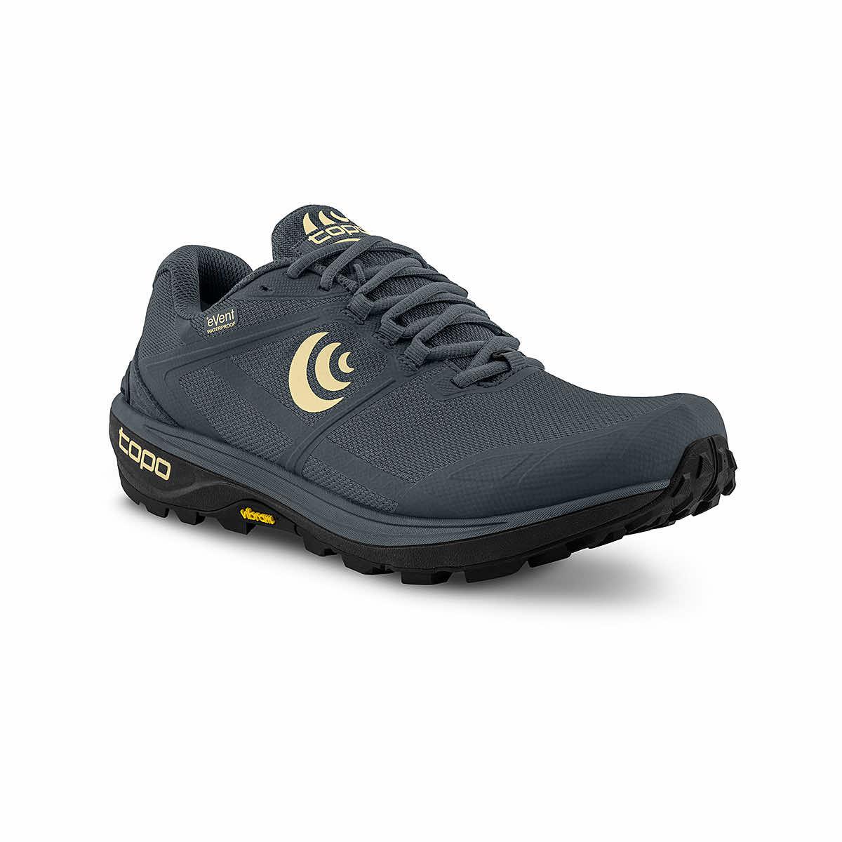 With a full eVent bootie construction, Women's Terraventure 4 Waterproof Running Shoes from Topo Athletic lock water out to keep your feet totally dry and comfortable in wet conditions. The highly praised Vibram Megagrip outsole delivers excellent traction and slip resistance, so nothing slows you down. The moderately cushioned platform offers a comfortable step-in feel, while the forefoot rock plate provides extra protection on rugged, technical trails. Lace-up with Terraventure 4 Waterproof Running Shoes - no rain check or weather delay is needed with the new waterproof trail runner.