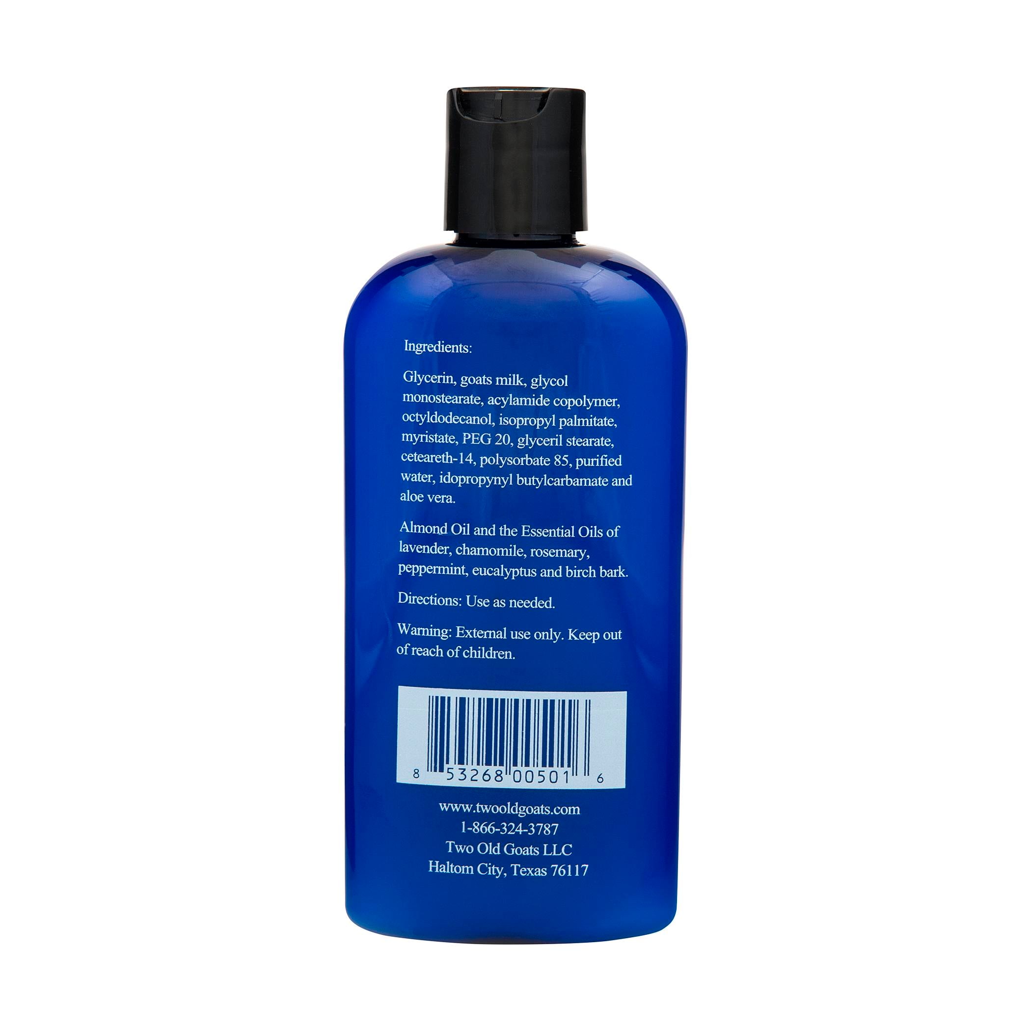 The Essential Oil Lotion from Two Old Goats is a strong formula that's ready to tackle your toughest aches and pains caused by swelling due to arthritis, fibromyalgia, gout, or injury. The goat's milk base carries a natural blend of six essential oils deep into your joints and muscles. Chamomile, lavender, rosemary, peppermint, eucalyptus, and birch bark work together to give both anti-inflammatory and analgesic properties. Daily applications have a cumulative effect, but you'll begin feeling relief instantly. Finally, pain management you can feel good about, without a strong, unpleasant medicinal odor!